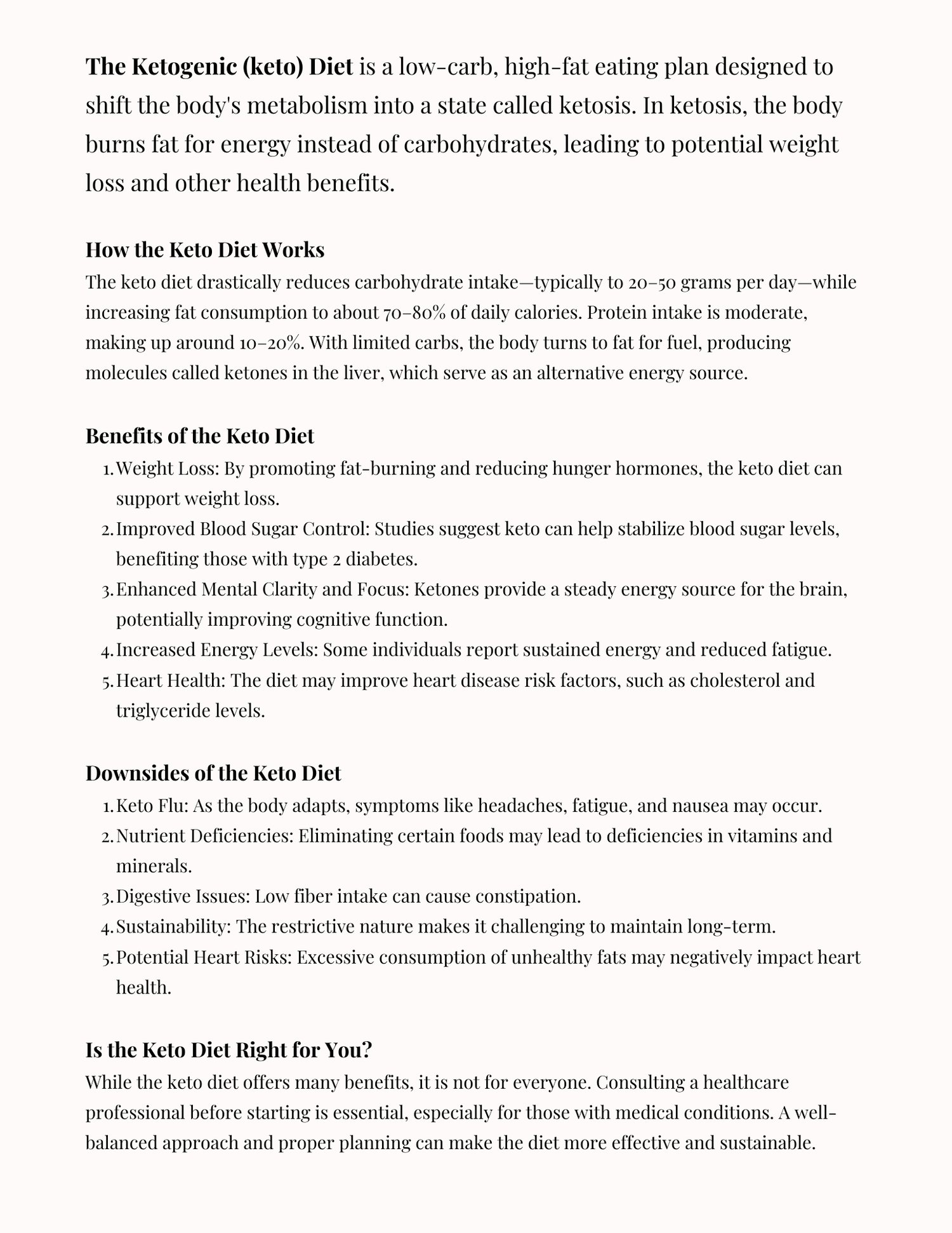 - Keto Diet Essentials: Get a solid understanding of the ketogenic diet. Learn how it works, its benefits, potential downsides, and whether it's right for you. โน๏ธ