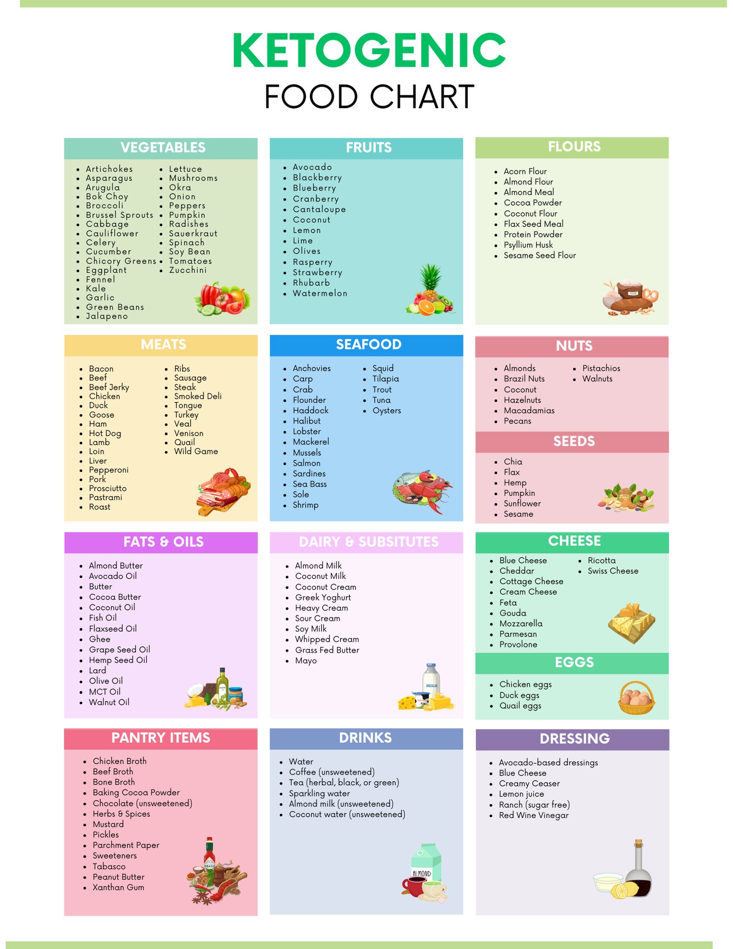 - Complete ketogenic food chart with 10+ food categories